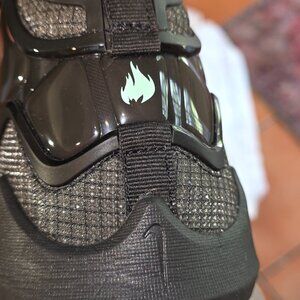 The shoe’s upper features a special construction using a material called Knitposite 2.0, which blends lightweight and breathable knit fabric with durable heat-molded overlays. It has black as the predominant color complemented by very small Glow Green accents, particularly on the Nike Swoosh. The Nike LeBron 19 incorporates Nike's innovative cushioning technology which combines a Max Air unit and a Zoom Air unit to support explosive on-court movements while also providing the required impact protection.