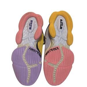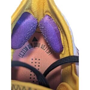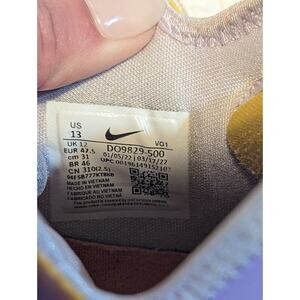 One shoe boasts a Lakers-inspired gold shade, while its counterpart flaunts a dusty purple hue. The toe box overlays exhibit a split design—black snakeskin on the left shoe and a solid peachy tone on the right. Inside/sole is Air Max and full-length Nike React foam give support and comfort.