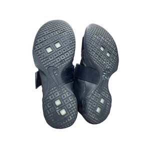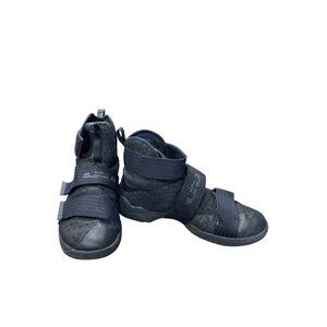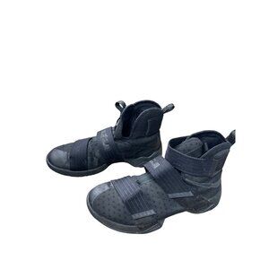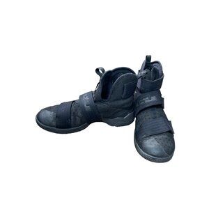 The Nike Lebron Soldier basketball shoes provide excellent support and comfort on the court with their triple strap design, ensuring a secure fit. The high-top style offers ankle protection, and the black color adds a sleek look. Ideal for athletes seeking performance and durability. In very good condition in and out with no defects noted. SKU 9177