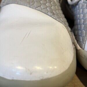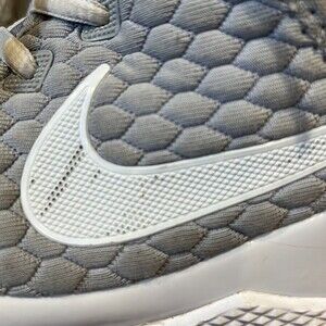 Nike Lebron Witness 3 ‘wolf grey’ colorway basketball sneaker. White patent leather toe. Quilted grey fabric. Embossed lion with crown logo on tongue. Double heel pull tabs. Good preowned condition, see photos. Some scuffs on the leather toes and swoosh logos.
