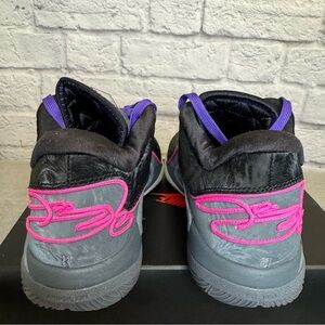 Stylish Nike athletic shoes. Black and gray upper. Accented with purple and pink details. Comfortable and sleek design.