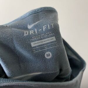 Black and blue graphite Legend 2.0 Ribbon Wrap active leggings from Nike. Style: 651332-010. Size M. Approximate flat lay measurements- Waist: 13.5” across. Rise: 10”. Inseam: 29.5”. Gently preowned condition with no tears or stains.