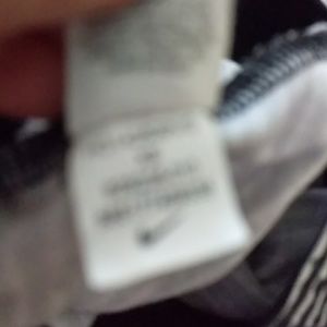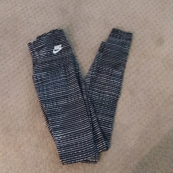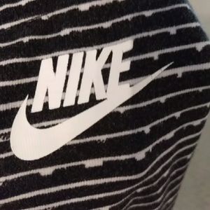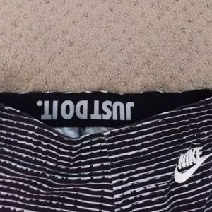 Nike leggings in black and white striped pattern. Nice and stretchy so comfortable to workout in. The design is flattering on the body. Inside of waistband says Just Do It. In great condition- logos are all intact
