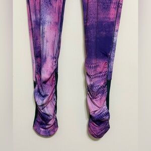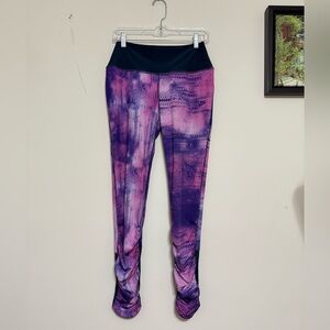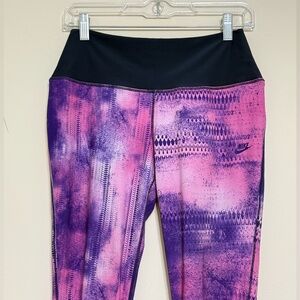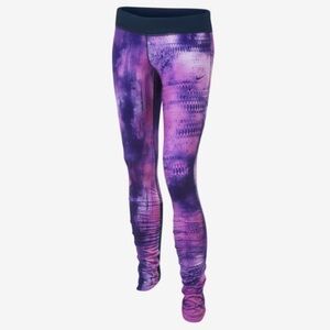 These leggings feature a purple and pink abstract Tie Dye print with a gray waistband and gathered detailing at the ankles. Made with Nike's Dri-FIT technology, the leggings are designed to wick away moisture, keeping the wearer dry and comfortable during physical activity.