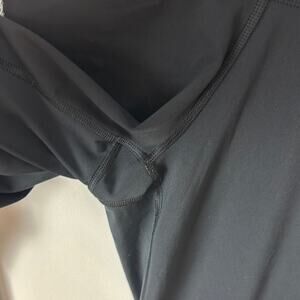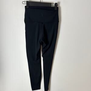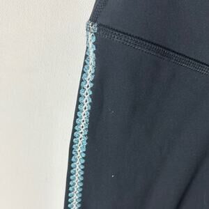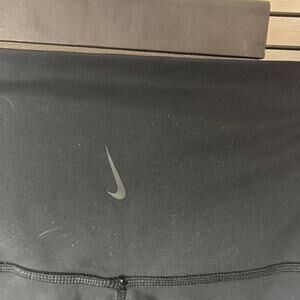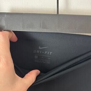Gently Used Nike Dri-Fit Leggings. These are a women's small. Mostly black with white and light blue stitching down the side of the legs. Vertical Nike logo on the back. 87% polyester, 13% spandex.