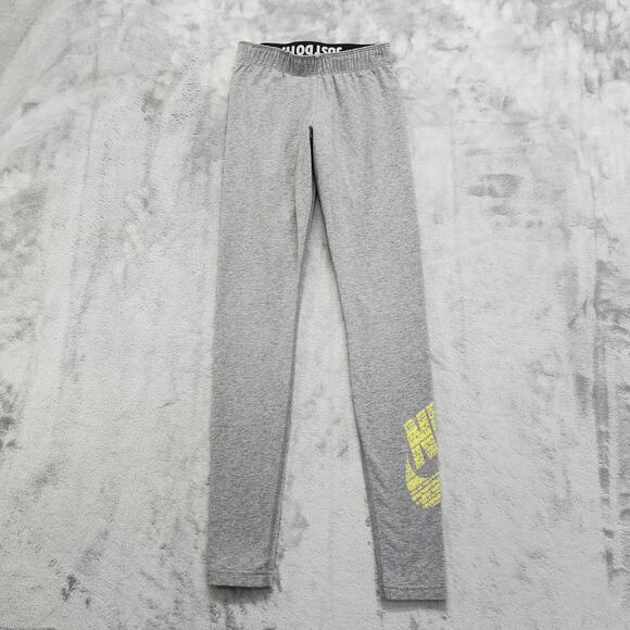 Nike Leggings Womens XS Heather Gray Yellow Logo Leg-A-See Fold Over Waistband Workout Gym Yoga Running Training Athleisure Casual