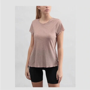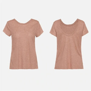 Lettuce Edge Yoga Training Tee Top Ribbed Lightweight Low Back High Neck — reversible. Can be worn scoop neck or as low back. So cute!!