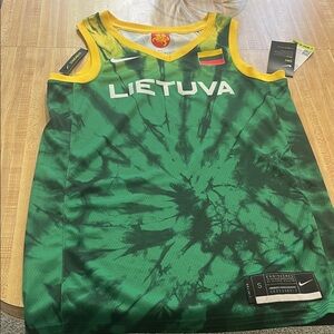 Vibrant green tie-dye jersey with yellow accents. Features Lietuva print and Nike branding.