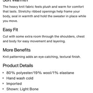 The heavy knit fabric feels plush and warm for comfort that lasts. Stretchy ribbed openings help frame your body, seal in warmth and hold the sweater in place while you move.