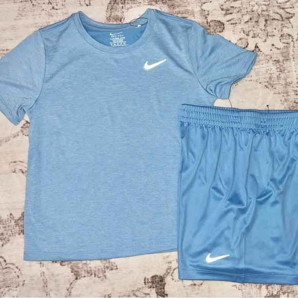 Light blue Nike shirt and shorts with white swoosh. Perfect for sports and leisure.
