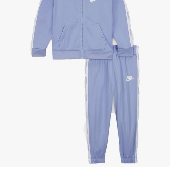 Boys Light blue Nike set with full zip jacket and pants. Features iconic logo. Ideal for sporty style.