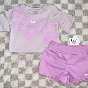 Charming Nike toddler outfit with floral pattern. Light pink top and shorts. Ideal for active days.