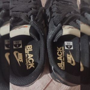 Up for grabs is the very now RARE GOLD Label "limited edition COMME des GARÇONS x Nike Air Pegasus 83". These are practically new, barely ever used, maybe a couple times, Please refer to photos for reference. These are a men's size 4, so 23CM, so these would be a Women's size 6 if interested. These were created to celebrate 2017 Met Gala while also paying tribute to the commemoration of the May 4 opening of “Rei Kawakubo/COMME des GARÇONS: Art of the In-Between”. Rocking a Triple Black finish, most of the shoe comes in a suede construction while the use of leather can be seen on the Swoosh branding on the paneling. Adding some contrast and luxe feel to the shoe is the Gold branding placed on the CDG heel branding. A Black out sole unit completes the Triple Black motif of the shoe.