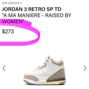 The A Ma Maniere x Jordan 3 TD "Raised by Women" is the toddler sizing of the collaboration between the Atlanta based retailer and Jordan Brand on Michael Jordan's third signature shoe. A Summer 2021 release, the "Raised by Women" is A Ma Maniere's first collaboration with Jordan Brand following its popular "Hand Wash Cold" collection with Nike in 2019. Decidedly vintage-looking, the