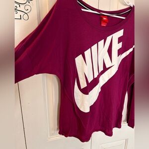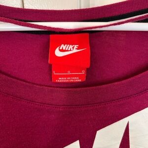 This is a Nike women's long sleeve shirt in burgundy, size Large. It features the Nike Swoosh logo accent and has a pullover style. Suitable for activewear occasions. It is part of the Nike Swoosh product line and is ideal for various activities like walking, running, hiking, and more.