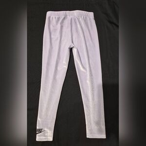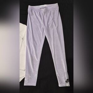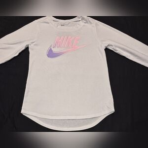 Nike long sleeve shirt in white with pink and purple logo. Paired with light purple velour leggings.