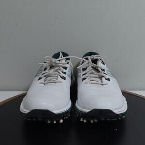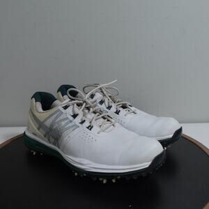 Pre-owned. Features a white and green colorway with Michigan State Spartans logo on tongue. Upper shows yellowing and surface wear, but structure remains intact. Cleats have minimal wear. Size tag reads Women’s US 7 / UK 4.5 / EUR 38 / CM 24.