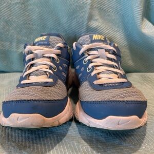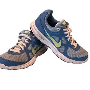 Gently pre-owned still lots of life left. These are a youth size 4.5 blue and lime green, Nike calls this color coast liquid lime ice blue.