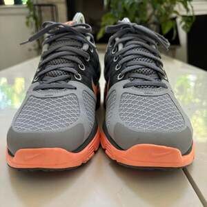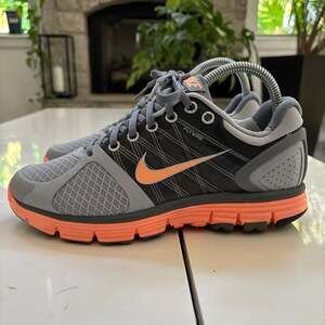 Nike LunarGlide+ 2 women's running shoes in a striking grey and orange colorway. These athletic shoes feature Flywire technology for supportive comfort and a lightweight feel, along with a Fitsoles for cushioning. The vibrant orange Lunarlon sole provides responsive cushioning and smooth transitions. Ideal for running, gym workouts, or casual athletic wear. Excellent pre-owned condition with minimal signs of wear. Will ship fast!