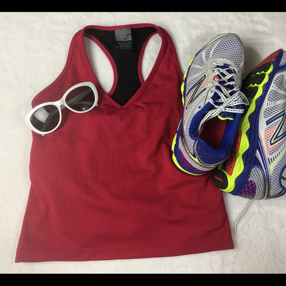Nike Raspberry/Black M 8/10 Dri-fit Top. Logo on back. Cut on the tag. Made of mesh-like fabric. All measurements approximate: Bust: 30", point of v neck down to bottom of hem: 11 3/4", Armpit to bottom hem: 12 1/2". * sports bra bottom elastic band cut out inside & fabric care tag missing*