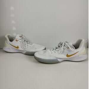 White/gold Nike athletic gym basketball shoes, mens size 11. Theyre in great condition, has a stain on the left shoe