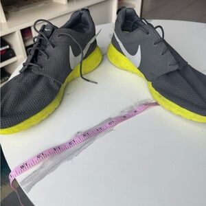 Nike athletic shoes in gray with vibrant yellow soles. Perfect for sports and casual wear.