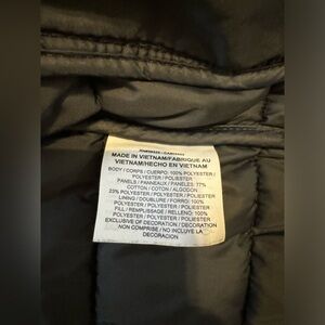 Black padded jacket, has an attached hood with a toggle drawstring fastening, a full zip closure, long sleeves, two pockets, high-low hem