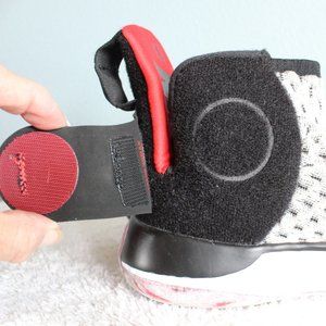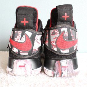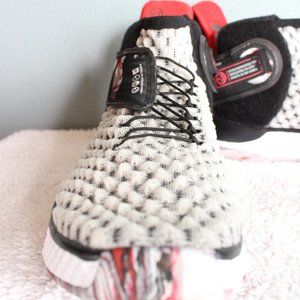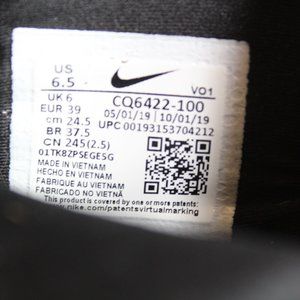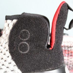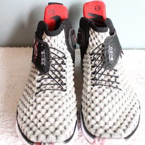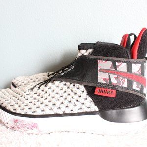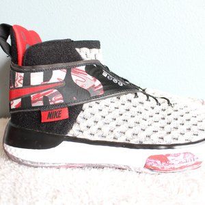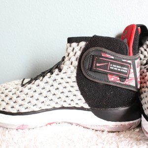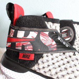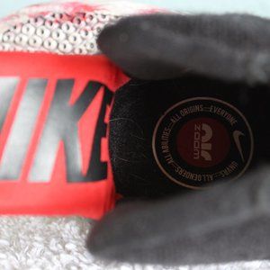 Stylish Nike athletic shoes. Features red and white design. I received these in excellent pre-owned condition, but my feet were too wide & chunky to fit in comfortably. I can tell the next size up will fit like a cuddly sock I could run in! The Velcro back is awesome, and very, very strong. Also looks fire.
