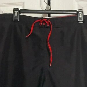 Polyester board shorts red & black - side pockets & mesh lining - board short lacing gusset fly. Approximate Measurements Laying flat: Waist 18” - waist to hem 18” . Preowned good used condition please check all pictures. (KF83024)
