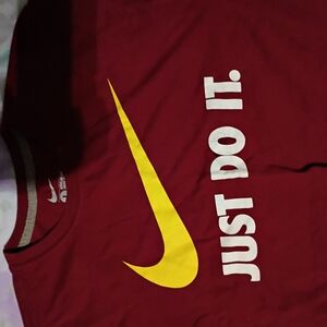 Burgundy shirt featuring a vibrant yellow Nike swoosh. Ideal for active play.