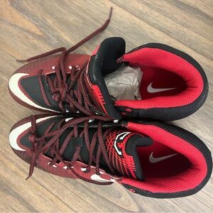 Dynamic Nike cleats in red and black. Features bold design with white swoosh. Brand new no box