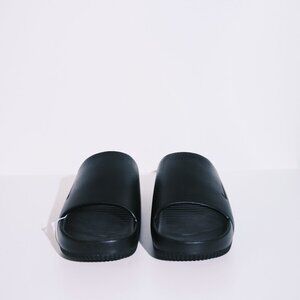 Sleek and minimal all-black slides with lightweight foam construction for all-day comfort. Water-friendly, easy to slip on, and perfect for lounging, travel, or casual wear. Textured footbed for grip and a durable outsole for traction. Gently cushioned and true to size.