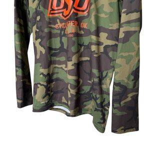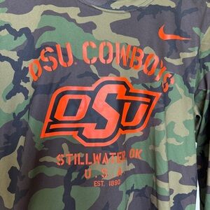 Keywords: Nike, men's t-shirt, long sleeve, camouflage, OSU Cowboys, sports, military appreciation, Dri-FIT, moisture-wicking, fall fashion, casual wear, crew neck, polyester, machine washable, multicolor.