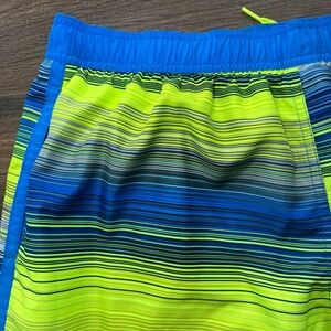 Nike Cargo Swim Trunks Blue Yellow Striped Mesh Liner Elastic Drawstring Waist Board Shorts Swimwear Side Pockets Embroidered Swoosh Logo
