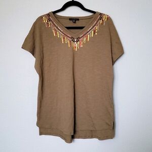 Stylish Nike tee with dynamic graphic. Soft fabric for everyday comfort. Has some marks on one sleeve and a faint one in the bottom front. Does stretch. Great for casual or lounge wear.