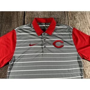 Nike Men's Cincinnati Reds Dri-Fit Gray Striped Golf Polo Shirt Size small. In good condition! Nike swoosh and Cincinnati Reds logo across the chest. Gray and white stripes all over. Red accents.