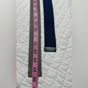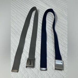 Stylish Nike belts in blue and gray. Features sleek silver buckles with iconic logo.