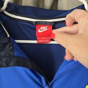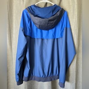 Stylish Nike windbreaker jacket in blue and gray. Features a zip-up front and hood.