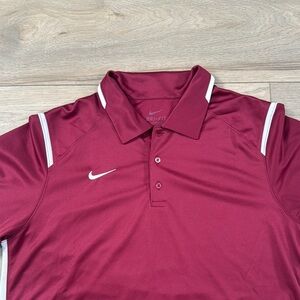 Nike men’s Gameday Dri fit polo, color is maroon and white. White accents are all a mesh breathable material. Three button collar and white stitched Nike logo. Logo is in perfect condition. Shirt is in excellent condition. Size Large.