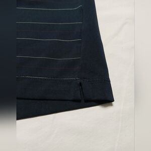 Stylish navy polo shirt featuring a subtle striped design. Perfect for casual outings or a relaxed office look.