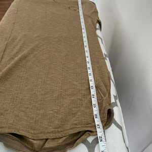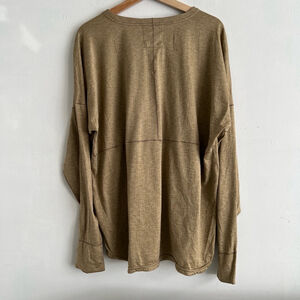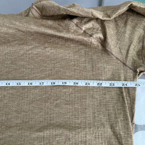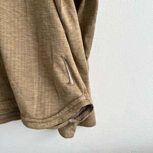 Pre-owned Nike Dri-FIT Yoga long-sleeve shirt, size XL. The shirt is a light brownish-green heather color. It's made from a soft, textured fabric. Measurements: 24" across the shoulders, 28" long from shoulder to hem. Features include a crew neck, long sleeves with thumbholes, and a small Nike logo on the sleeve. The shirt shows minor signs of wear, including slight fading and pilling. No major stains or tears are visible. The material is predominantly cotton blend. The tag indicates it was made in Indonesia.
