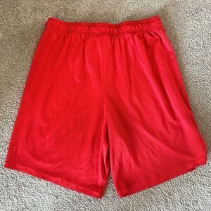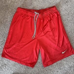 These Nike athletic shorts feature a vibrant red color and are made from lightweight breathable fabric, perfect for sports or casual wear. The loose-fitting design includes an elastic waistband with a contrasting white drawstring for an adjustable fit.