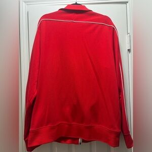 Bold red track jacket with white accents. Features a zip-up front and side pockets. Iconic Nike swoosh on the chest.