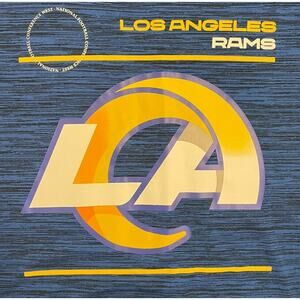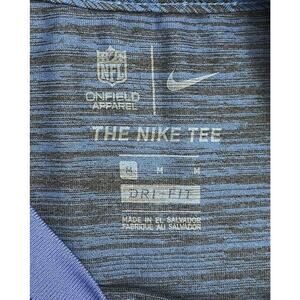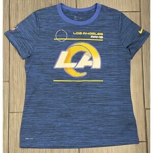 This is a Nike men's performance T-shirt in royal blue, officially licensed by the National Football League (NFL) for the Los Angeles Rams. It is a size medium with the team's logo on the front. The shirt is designed for the regular season and features the team's colors. Made in El Salvador, it is part of the Sideline Velocity Legend collection. Pit to pit is 20 inches. Top of shoulder to bottom is 26 inches.