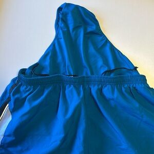 short in size XL. 5 inch inseam. The color is a teal-ish blue. See photos of inside label and drawstring for most accurate color.