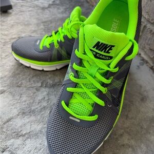 Stylish Nike sneakers with vibrant neon green details. Ideal for sports and casual wear. Like New