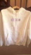 White hoodie with a bold purple graphic. Comfortable and stylish.