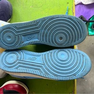 Elevate your game with these Nike shoes. Sky blue design with white accents. Ideal for sports and casual wear.leather Air Force 1 blue and white fits ladies size 12