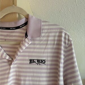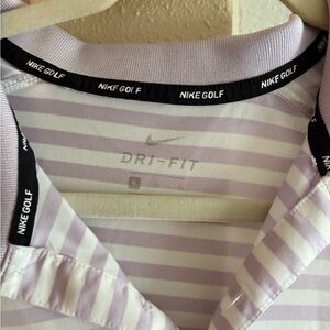 Stylish Nike polo with light purple and white stripes. Perfect for casual outings. Comfortable and sleek design. See picture for small stain