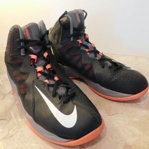 Very nice pair of Nike Air Max Stutter Step sneakers size 7.5. Black with orange. Mid top athletic shoes. Very good, preowned condition. Great for sports, casual wear, travel, etc. Comes from smoke free, pet free home. Fast ship. Happy to answer questions.